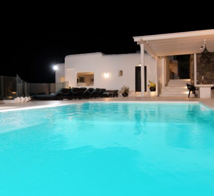 The luxurious 5-bedroom villa, situated in the south of the Island ,in the area of Aleomandra, 80 meters from the sea front with magnificent views ,overlooking the Aegean in the direction of Naxos island, well protected by the strong northern winds.