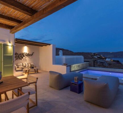 The luxurious 4-bedroom villa is situated in the south of the Island, in the area of Aleomandra, 80 meters from the sea front with magnificent views, overlooking the Aegean in the direction of Naxos island, well protected by the strong northern winds. The villa is modernly furnished and has a big swimming pool.