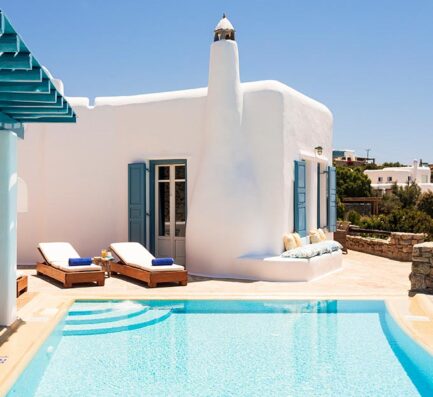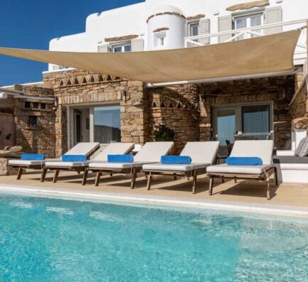 Villa Mia is a modern-style house with Mykonian charm. It is situated in the Pouli area, which has a superb sunset. The lounge area is an ideal place to spend lazy hot summer days around the private pool. However, it is only a short drive away from the party crowd in Mykonos Town.