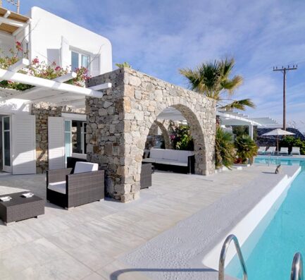 Brilliantly contemporary yet perfectly in tune with its setting, villa Agapi is a gorgeous 220sq.m. 4 bedroom residence that belongs to a complex of three independent villas overlooking the bay of Kalafatis. The low-rise structure incorporates elements of traditional architecture and natural materials to represent its relationship both to the local architecture and the arid Cycladic landscape.