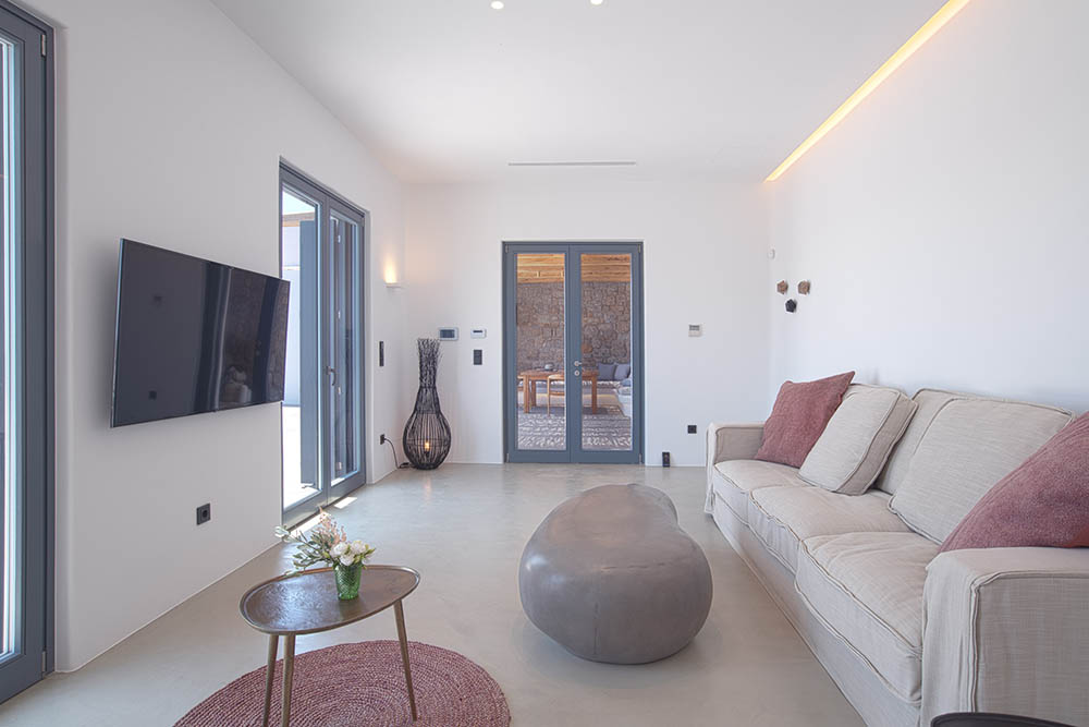 This villa is part of a brand-new family 2-villa complex located in the south part of the island. The location offers unique tranquility away from any other residential development and unobstructed stunning views towards Divouno and Kalafati Beach and the deep blue waters of the Aegean Sea.
