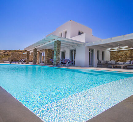The villa is built on a plot of about 4,5 acres, in amphitheater location, occupying a total area of 430,00 m2 two levels, comprising of an open space living room, dining room, fully equipped kitchen, 3 bedrooms master, 1 WC for quests and 3 studio for quests and 1 studio ideal for service staff or guests. There are shaded lounge and dining areas with BBQ while the comfortable sunbathing beds around the large private infinity pool, offer the perfect scenery to enjoy the day in privacy. We offer daily cleaning and twice a week change of linen, to all our villas in Mykonos.