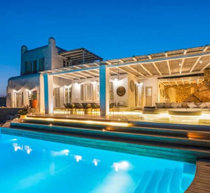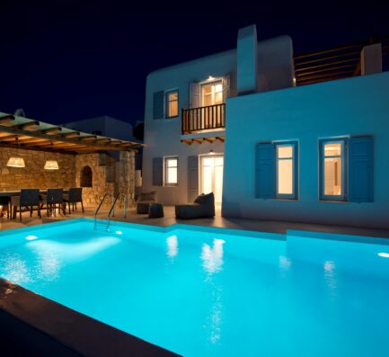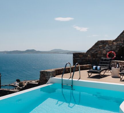 The villa is built on the slope of a small hill overlooking the emerald waters and the Bay of Choulakia, Spirit Blue Villa captivates the eye and heart at first glance. Facing Southwest, towards the sacred island of Delos and the mountains of Rineia, Villa Delos is coated with the mesmerizing red and golden hues of the sunset resting in the sea, offering moments of ultimate relaxation in the pool while marveling at the Aegean. Remember the terrace, the outdoor pool, and other outdoor premises, this 3-bedroom villa covers 130 m2 of pure luxury and comfort and is divided into two levels.