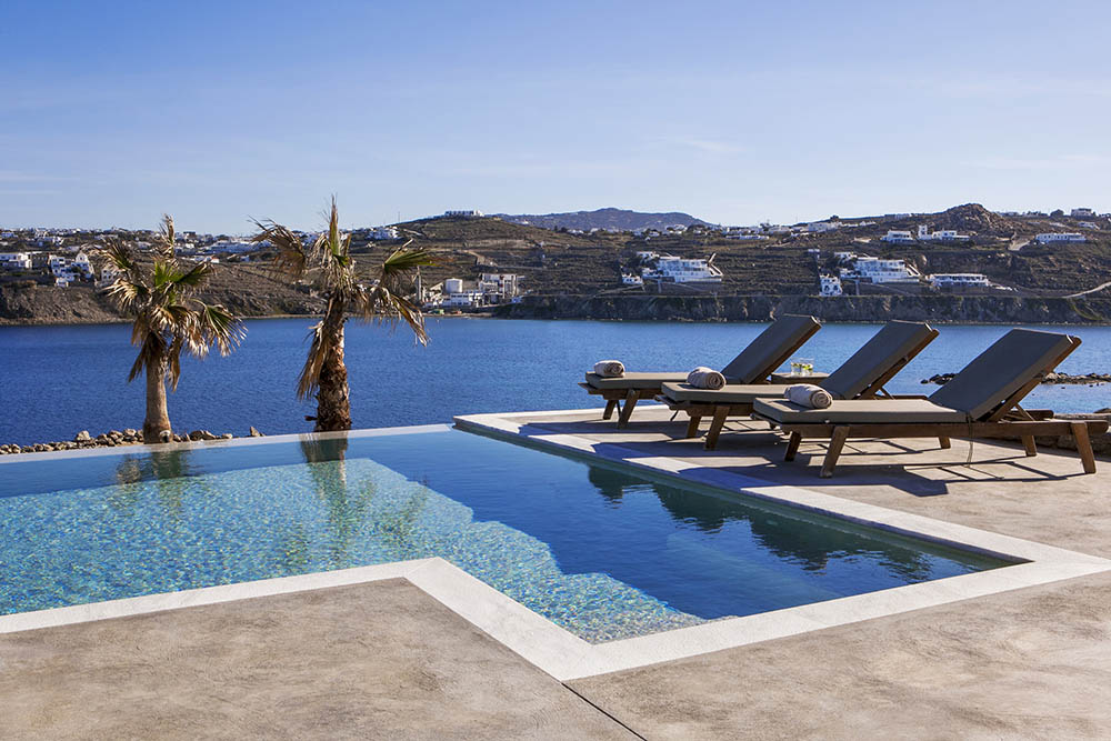 The property features a large and elegant infinity swimming pool of 30sq m2.Latters are surrounded by a spacious sun deck setting which includes a large outdoor and pergola shaded lounge area equipped with comfortable sofas with cushions sun beds deck chairs paired with a large dining table which predisposes guests to enjoy a delicious meal or cocktail while watching the majestic sunrise, listening to the sounds of the sea and overlooking Mykonos’s Little Venice. The excellent landscaped garden is filled with palm trees and a selection of flowers calming the senses and creating a romantic atmosphere of relaxation and wellness.