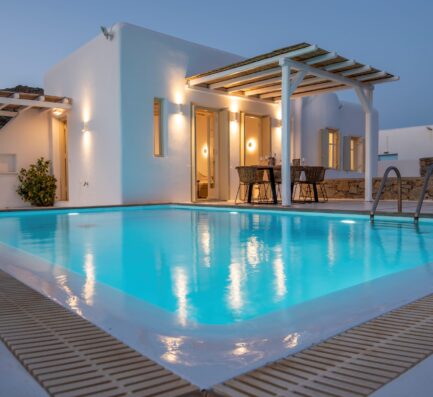 Villa Cama is located in an high-end area of Mykonos island, Aleomandra. The Villa is part of a gated complex with independent villas, having access to a semi-private beach. Ornos and Agios Ioannis beaches are only a short ride away