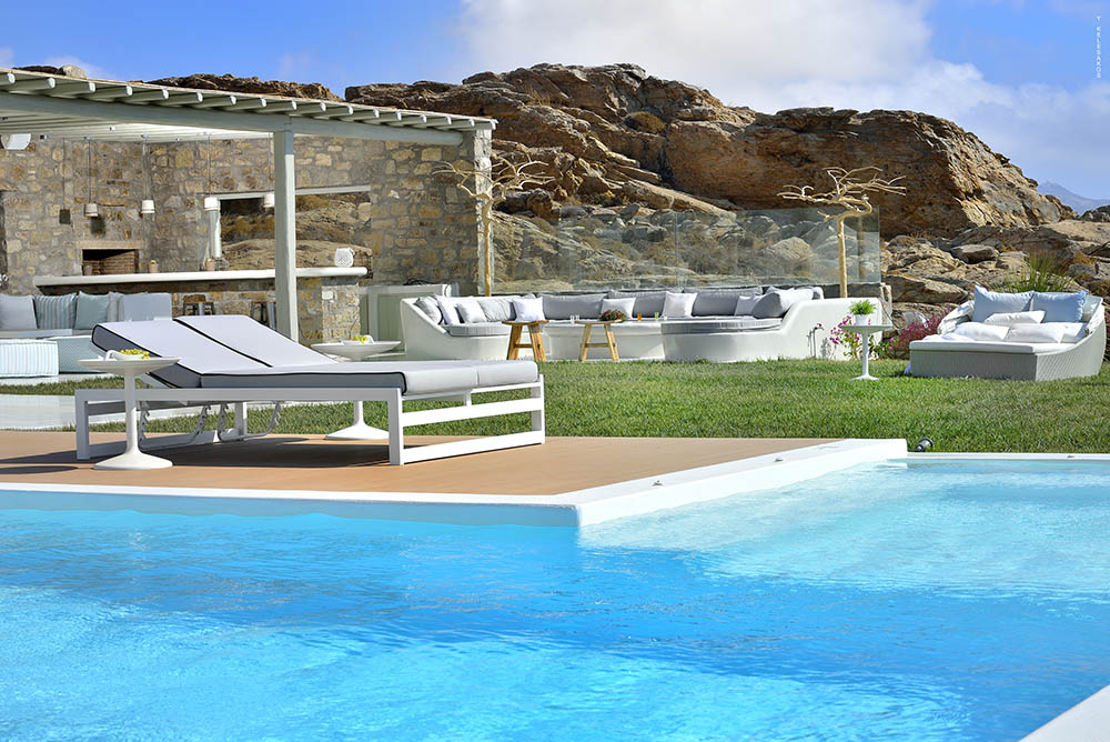 Villa Danae is a beautiful 6-bedroom property with unlimited sea views, located on a hilltop above Elia beach. The 2.000 sq. m. plot with flowers, cactuses and other decorative plants give the guests an abundance of spaces to enjoy and offer the opportunity to relax at the outdoor space which features an Infinity Pool, grass area, multiple large lounges and a dining area with a bar and a built-in BBQ.