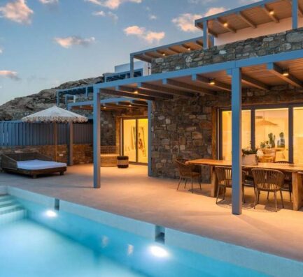 Villa Emerald is a 230 sqm property which unfolds in three levels giving a possibility of interior autonomy. It has a private pool and is located in Ornos, Mykonos.