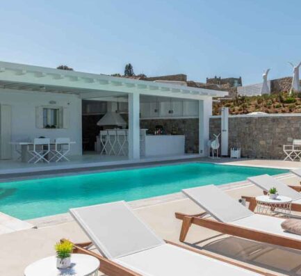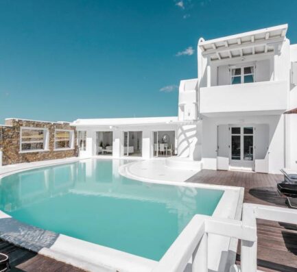 The Concept: Simplicity, the Art of life A stylish reflection of the cosmopolitan Mykonos lifestyle but with a traditional touch, Villa Eva, sits gracefully on the imposing spot of Kanalia, affording a divine view of the breathtaking Aegean Sea all the way to the islands of Syros and Tinos & mykonos town (windmills). Tranquility, serenity, space and calm are waiting to welcome you at an impeccable villa and yet you are only 15 minutes away from the famous Mykonos Town as well as 15 minute drive from Nammos, one of the four biggest clubs all over the world.