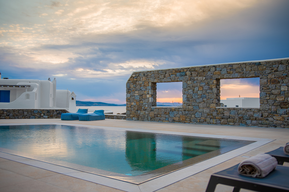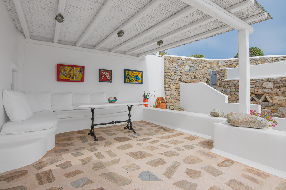 the villa offers charming outdoor spaces with sensational sunset views over the Aegean Sea and the tiny island of Delos.