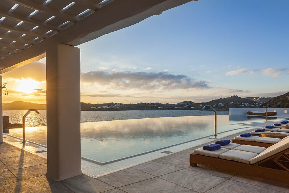 Villa Liberta is perched on the waterfront of the Agios Lazaros Mykonos private 10-Villa estate and enjoys an enviable view of Delos and Rhenea islands over a majestic drop to the sea, offering the picture-perfect Mykonos sunset and direct access to the sea and jetty.