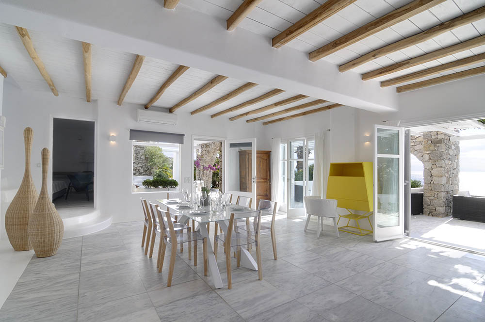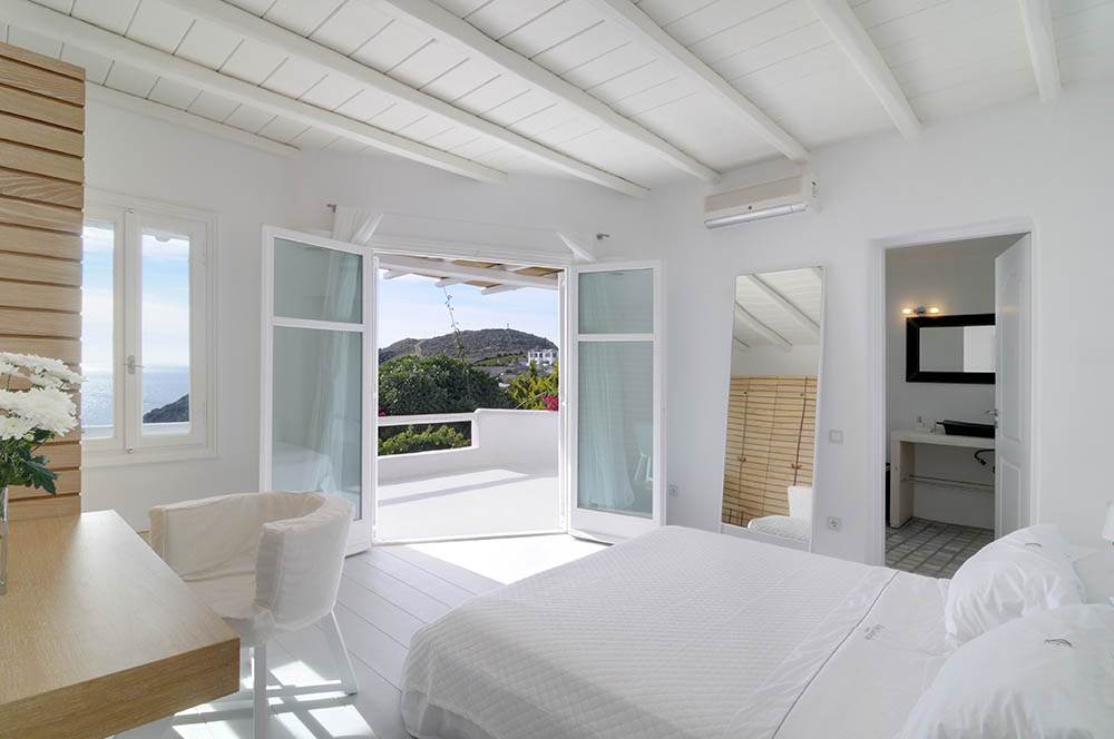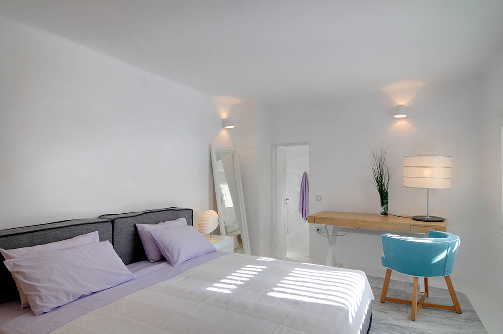 The villa consists of 5 bedrooms in total, 3 in the main house and two which are guesthouses pool adjacent. All bedrooms have en-suite bathrooms. The main house bedrooms (3) have air- condition, satellite TV and Wi-Fi internet support. The pool adjacent bedrooms (2) also have air-condition and one of them has sofa that can open up to a double bed that can sleep one or two children. The nearest beaches are Nammos, Ai-Yiannis, Glyfadi and Ornos beach. The distance from the town centre and airport is between 4 and 5 kilometers.