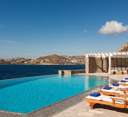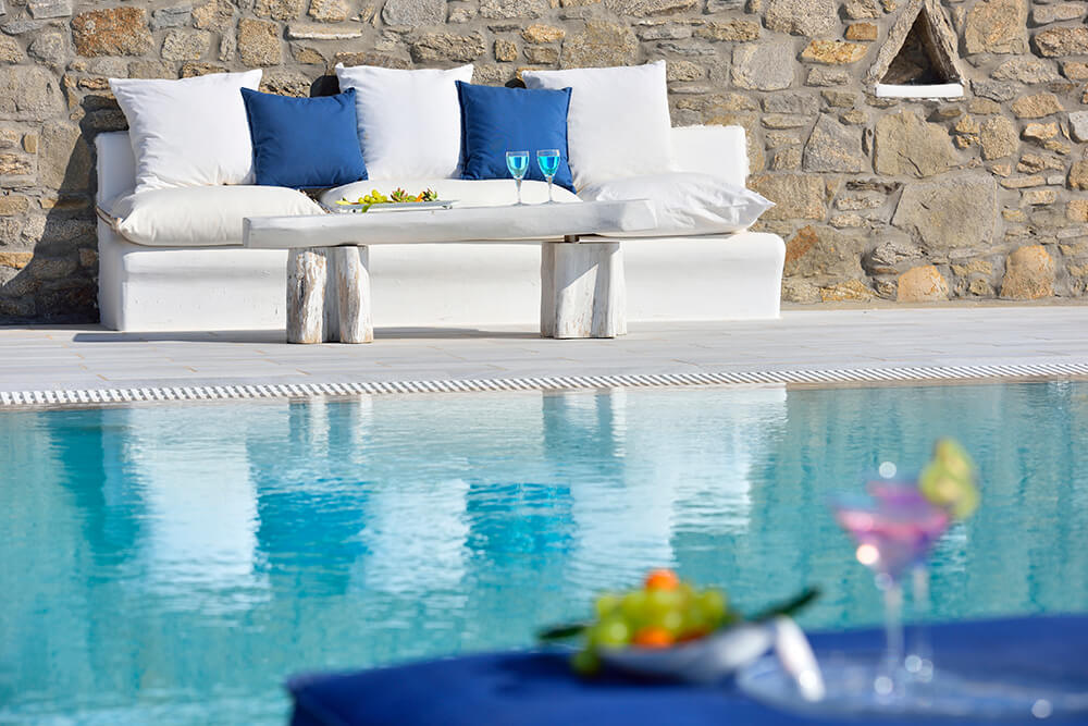 Villa Mykonos Estate in Super Paradise, Mykonos invites you to indulge and create memorable time with your loved ones. Dive into its exquisite architecture and amenities and get a taste of a Super Paradise villa. Mykonos Estate redefines the word bliss! Located in the southern part of Mykonos, this luxurious 390m2 (4200 ft2) dream villa, set in a 2000m2 (21500 ft2) exclusive plot will “spoil” your senses with its exquisite architecture, large living spaces, revitalizing swimming pool, shaded lounge area, ample terrace and a view of the deep blue Aegean Sea. Unbeatable!