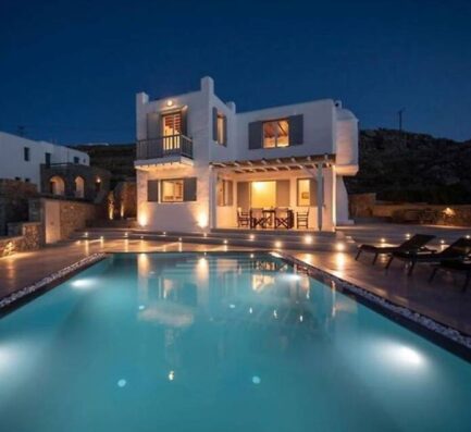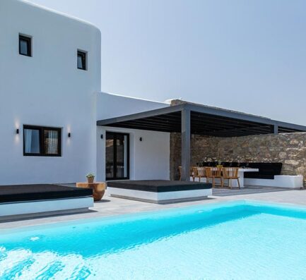 The luxurious 4-bedroom villa is situated in the south of the Island, in the area of Aleomandra, 80 meters from the sea front with magnificent views, overlooking the Aegean in the direction of Naxos island, well protected by the strong northern winds. The villa is modernly furnished and has a big swimming pool.