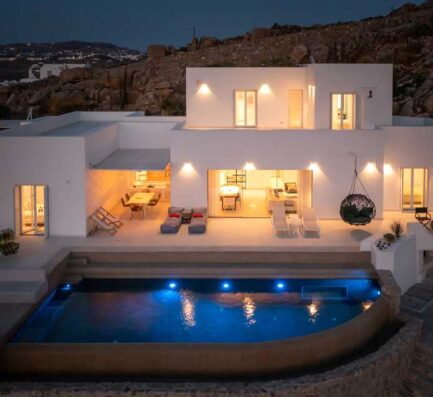 Situated at a privileged plot of land that affords glorious views of the Aegean, villa Starfish is a handsome 250sq.m. four bedroom residence that perfectly captures the island’s timeless panache. The structure, a stone-clad slab designed to have minimal impact on the landscape, spans two levels that open to terraces equipped with all the open-air living essentials: there are pergola shaded lounge and dining spaces and a gorgeous infinity pool, all oriented toward the seascape. Although the residence is part of a 3-house complex, it is configured in such a way that it feels private and completely open to the glorious landscape at the same time.